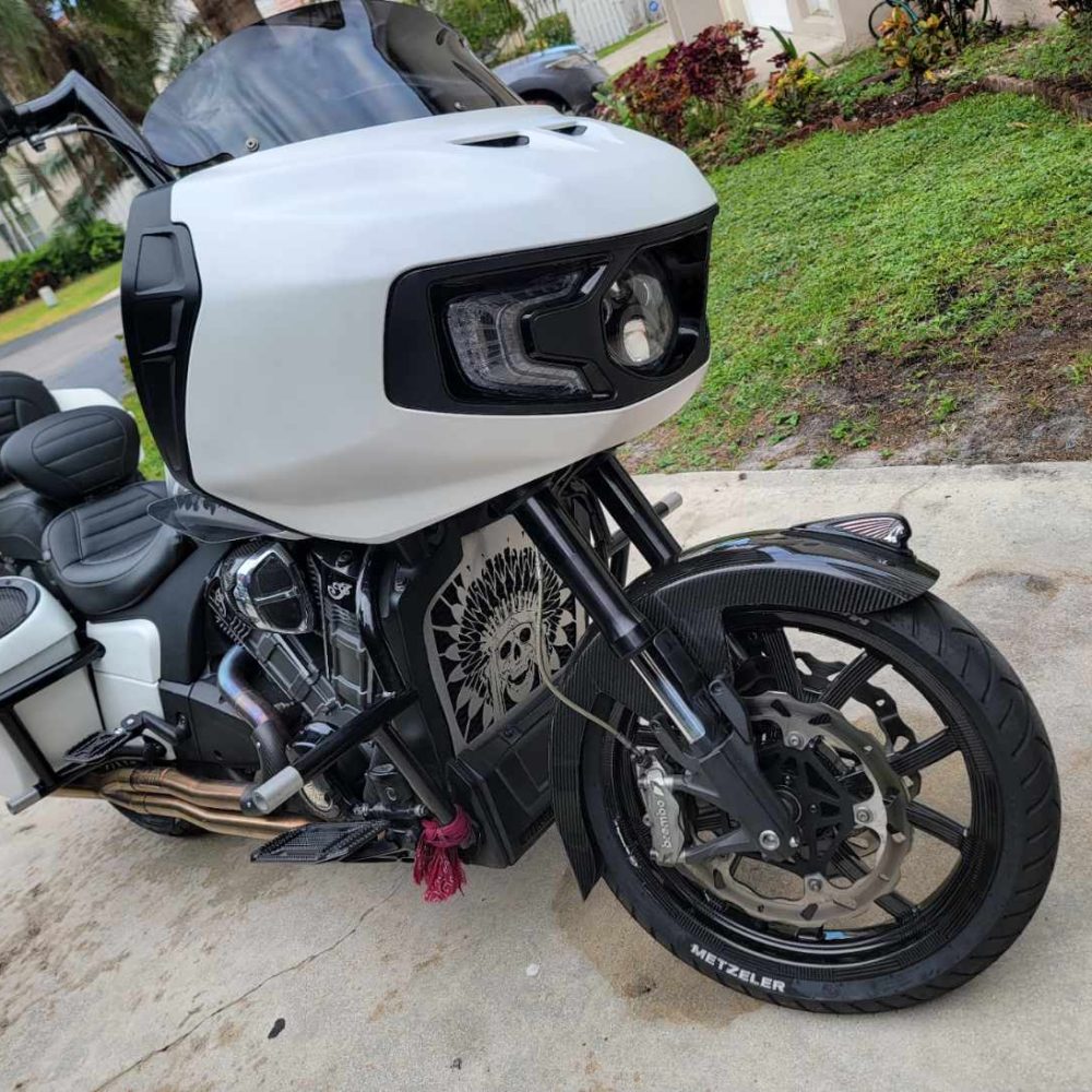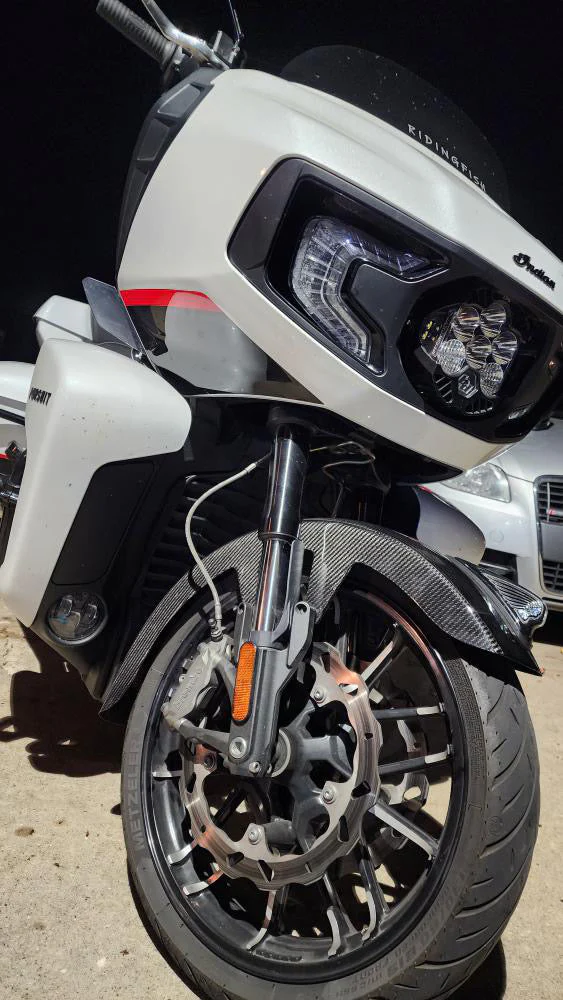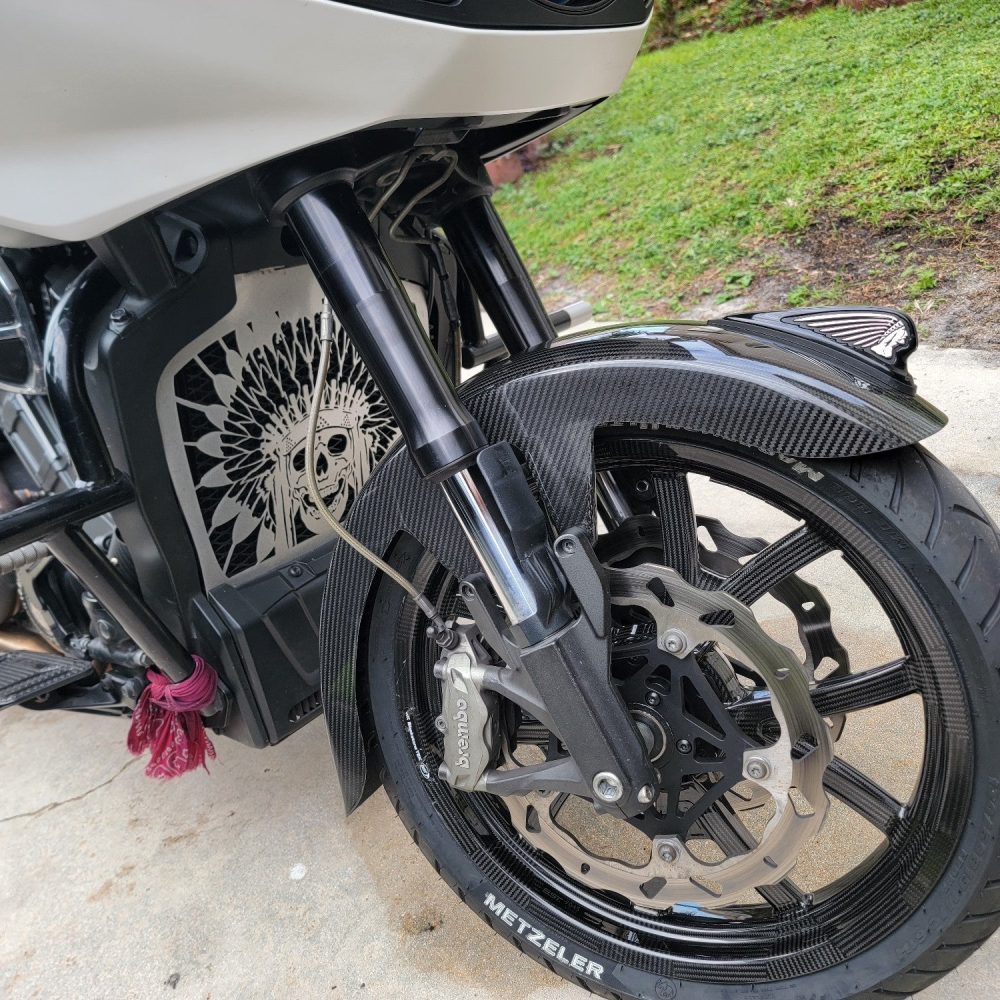 100% Carbon Fiber Front fender is pre drilled to accommodate the light up Indian war bonnet this fender is Compatible with all Indian Challengers and Pursuits with a total weight 1.06LB